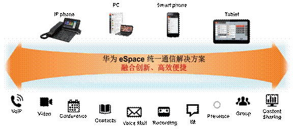 华为凭借在IP通信领域的技术积累和对客户需求的良好把握,推出了一种全新的基于IP技术的融合通讯与应用平台的企业信息化一体化解决方案——华为eSpace统一通信解决方案。华为eSpace统一通信提供了电话、传真、多媒体会议、即时通信、状态呈现、企业通讯录、统一消息等众多应用服务,为您的员工提供了一种更个性化、更及时的通信方法。利用这种方法,您能够理顺重要的业务流程,实现前所未有的便捷沟通、高效协作,提供客户响应速度、移动能力和安全性。华为eSpace统一通信解决方案着眼于企业信息化业务需求,为企业客户提供端到端的整体解决方案,与企业内部已有应用系统有机融合,全方位的帮助企业实现各种通讯及协作办公需求,帮助客户降低信息化建设及维护成本,提高客户日常工作便利性,提升工作效率,提升企业核心竞争力。