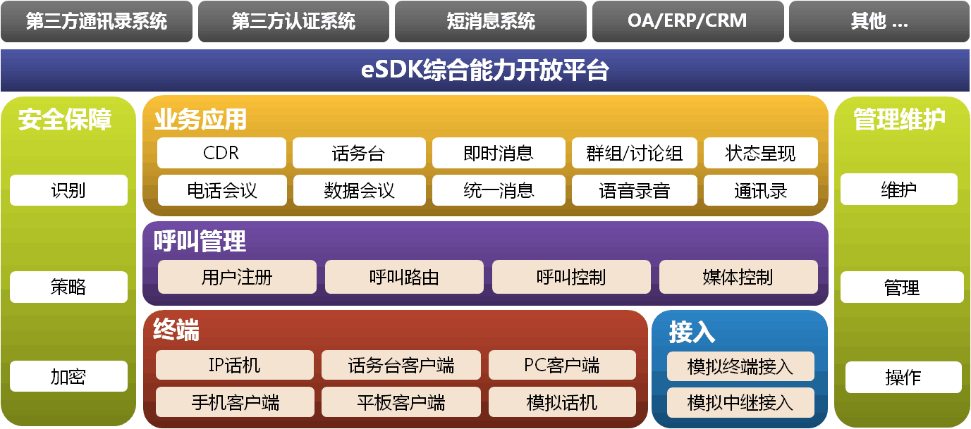 系统架构华为eSpace统一通信系统按逻辑可划分为三层:终端用户、接入网关:终端用户,包括IP话机,模拟话机、PC软终端、平板客户端和手机软客户端;接入网关包括了系列化落地网关,提供本地出局和本地再生功能;呼叫管理:由U1900系列网关内置,提供用户注册、路由和呼叫控制等能力;业务应用:提供丰富的业务功能,包括即时消息、群组、状态呈现、统一消息、录音和会议等功能;华为eSpace统一通信系统还提供了完善的端到端安全保障机制及丰富的管理维护手段。此外,系统还支持跟第三方通讯录系统、第三方认证系统等进行对接集成。