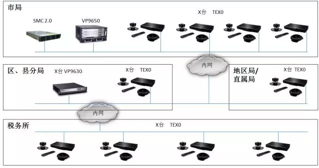华为作为业界领先的高清视讯解决方案供应商,针对北京国税的上述需求,提供了全高清视频会议解决方案,包括一代全编全解MCU VP9650(市局)和VP9630(区、县)、新一代TE系列高清会议终端,以及统一的视讯业务管理系统SMC2.0。