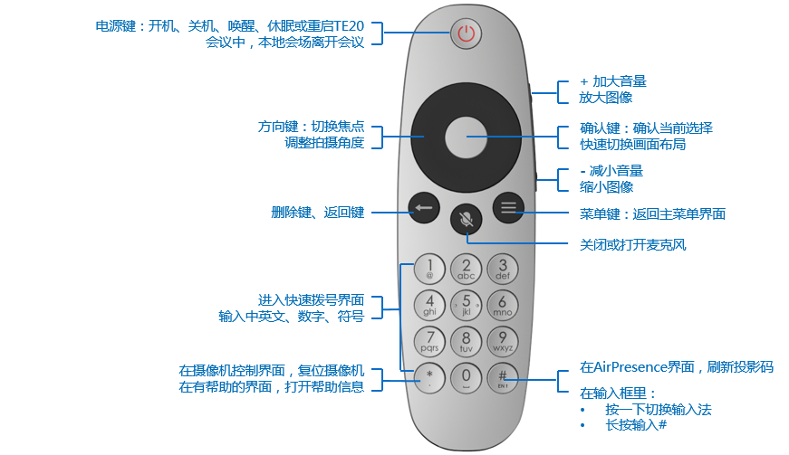 华为视频会议终端TE10/TE20是一款创新型云视频会议终端,六合一轻巧设计,专业音视频效果,超强网络适应能力,支持与广泛的云平台对接,完美满足紧凑型会议室和异地差旅途中视频协同需求。今天云南索沃小编带大家一起来了解华为视频会议终端TE10/20遥控器按键及功能介绍。