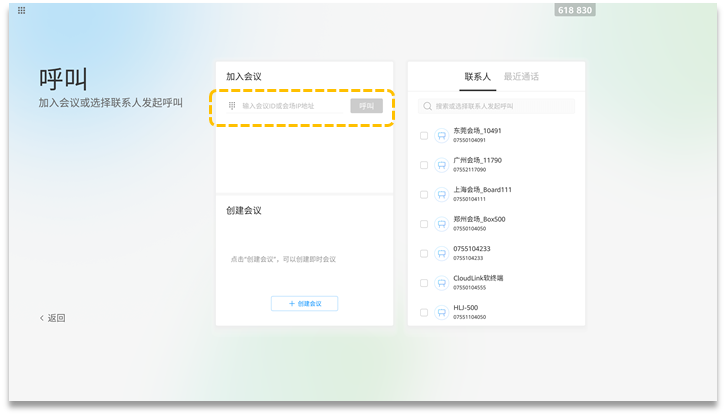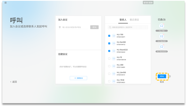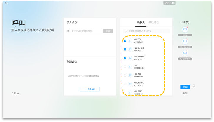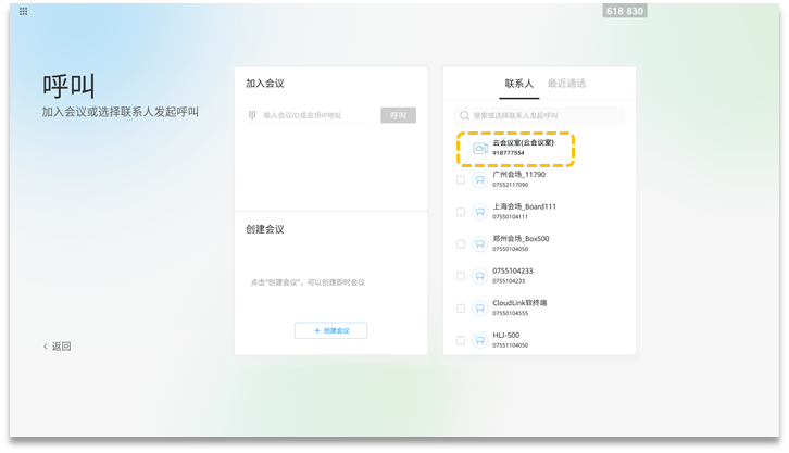 输入会场关键字后,当会场名出现在搜索结果中时,点击会场名可以选中该会场。也可以在联系人中选择并呼叫单个会场。