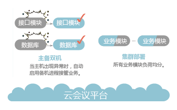 双机是指当主机发生故障时,由备机接管业务;集群是指某个业务节点通过多台集群分担负荷,可以提高系统支持的容量、性能以及可靠性。华为云会议主要系统部件的HA(High Availability)方案如下图所示。