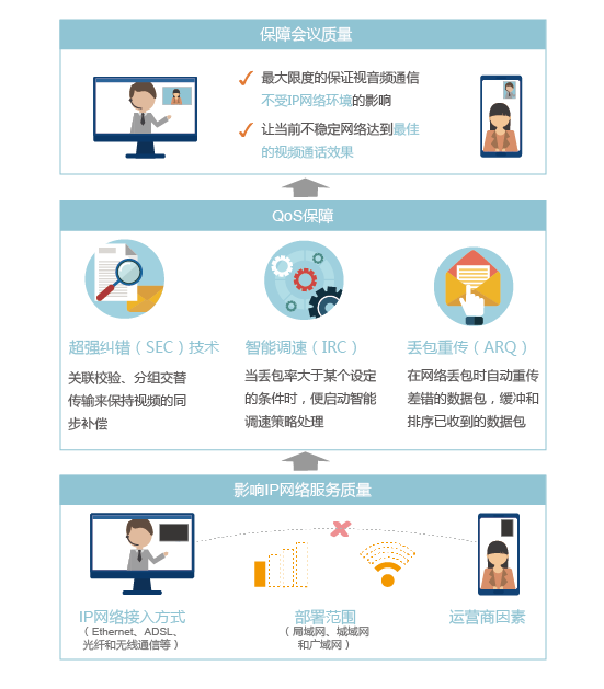 华为云会议采用了创新的超强纠错(SEC)技术、智能调速(IRC)技术和丢包重传(ARQ)方案实现了QoS的保证。