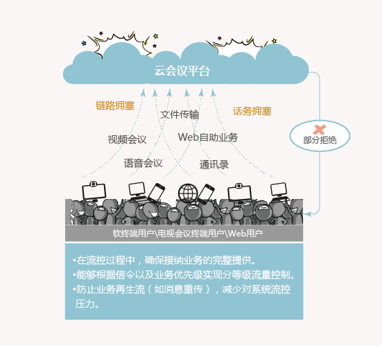 华为云会议支持流量控制(简称流控),在系统发生过载的情况下,通过拒绝新呼叫的手段,也能保证部分正在运行的业务正常运行,并促使整个系统逐渐恢复正常。