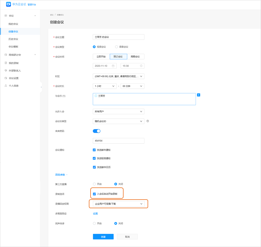 华为云会议如何创建录制会议?可以在创建会议时勾选表示第一个与会方入会后,系统自动开启录制;不勾选表示需手动在会控页面开启录制。