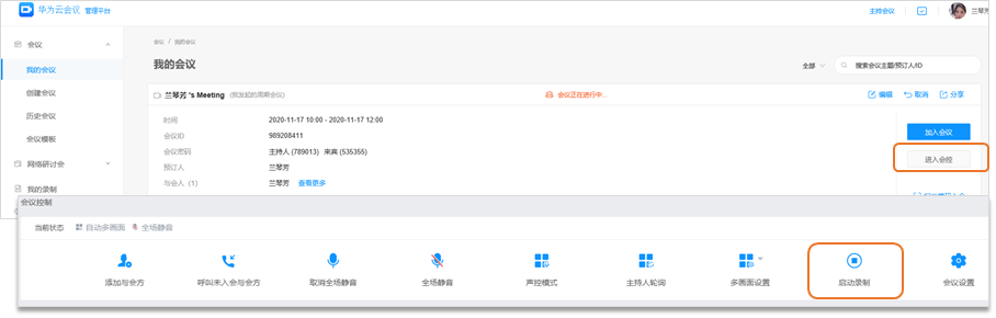 如果创建录制会议时没有设置“入会后自动开始录制”,则需要在会控界面打开会议录制。