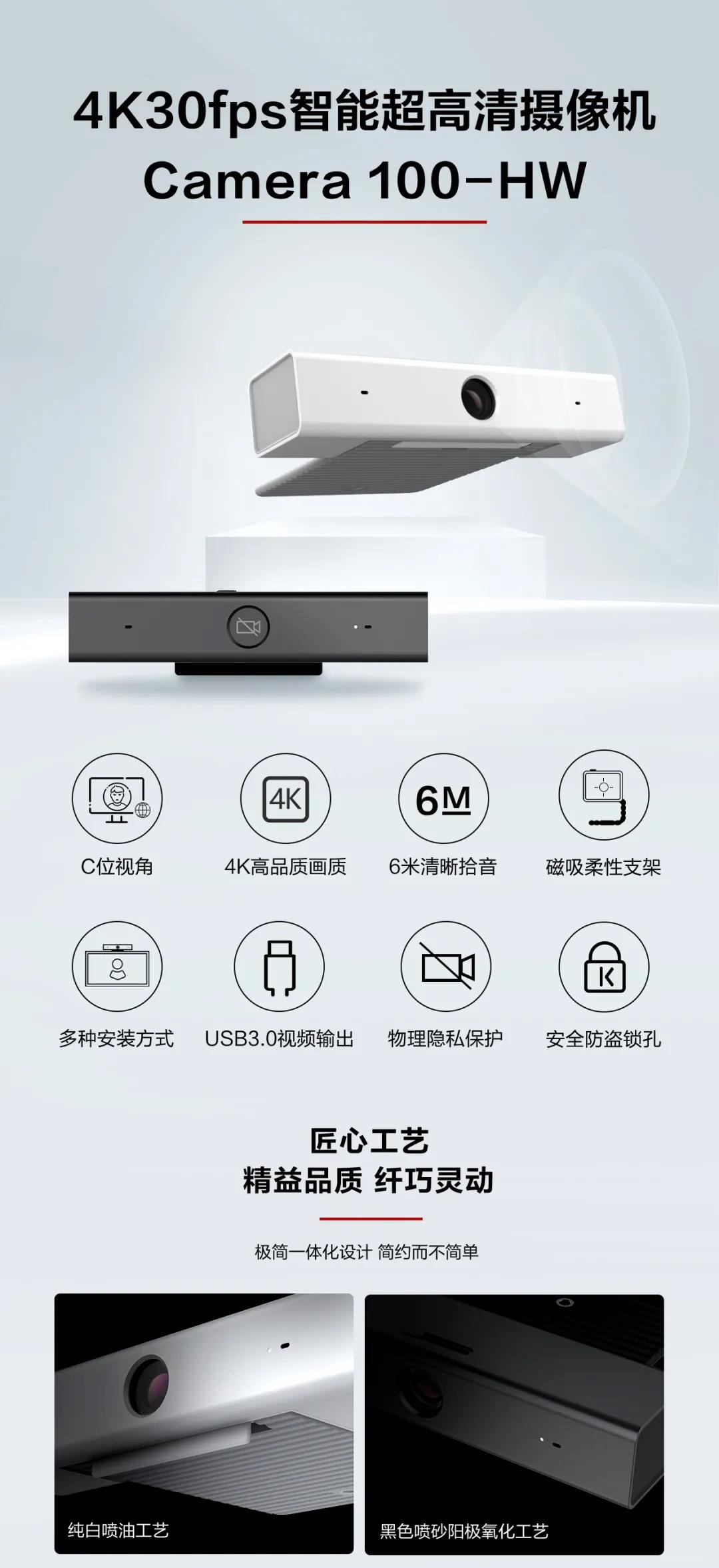 华为视频会议摄像机Camera 100-HW是一款全新的普及型智能超高清摄像机,采用USB3.0视频传输,无畸变广角镜头,6X数字变焦,智能呈现C位视角。内置2个拾音麦克,180度6米清晰拾音,为用户带来全新的视频沟通体验,适用于中小型会议室应用场景。