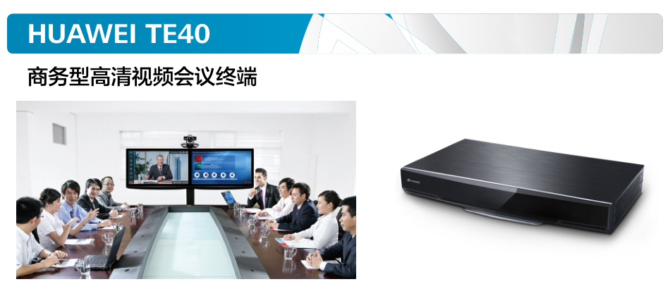 华为TE40是新一代商务型全高清视频会议终端。强大的性能提供双路1080P60极致高清画面和AAC-LD宽频语音,带来面对面沟通体验;Wi-Fi互联、无线数据共享,减少连线,便于会议室部署和使用,是中小型视频会议建设的佳选择。